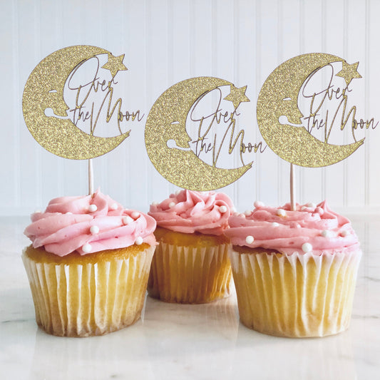 Over The Moon Baby Shower Decorations, Moon and Stars Baby Shower, Lunar Moon Baby Shower, Moon Cupcake Toppers Set of 10