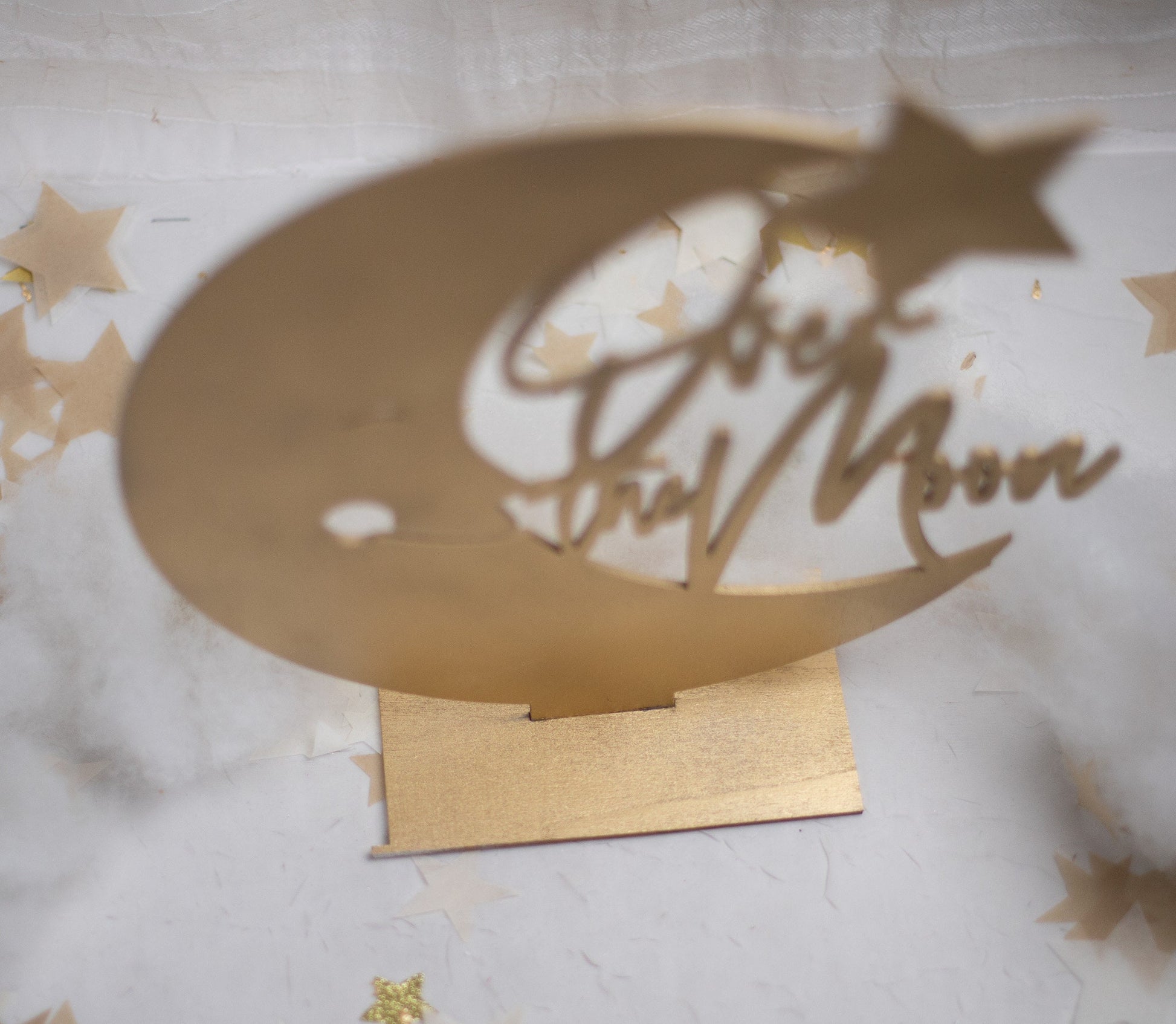 If you are having an over the moon baby shower this moon table centerpiece is dreamy and will add the perfect touch to baby girl shower decoration or baby boy shower. Perfect for a baby shower, baby sprinkle, gender reveal or over the moon baby shower. It is so easy to add sparkle and shine to your baby shower table decorations, cake table, desert table, or on guest tables.